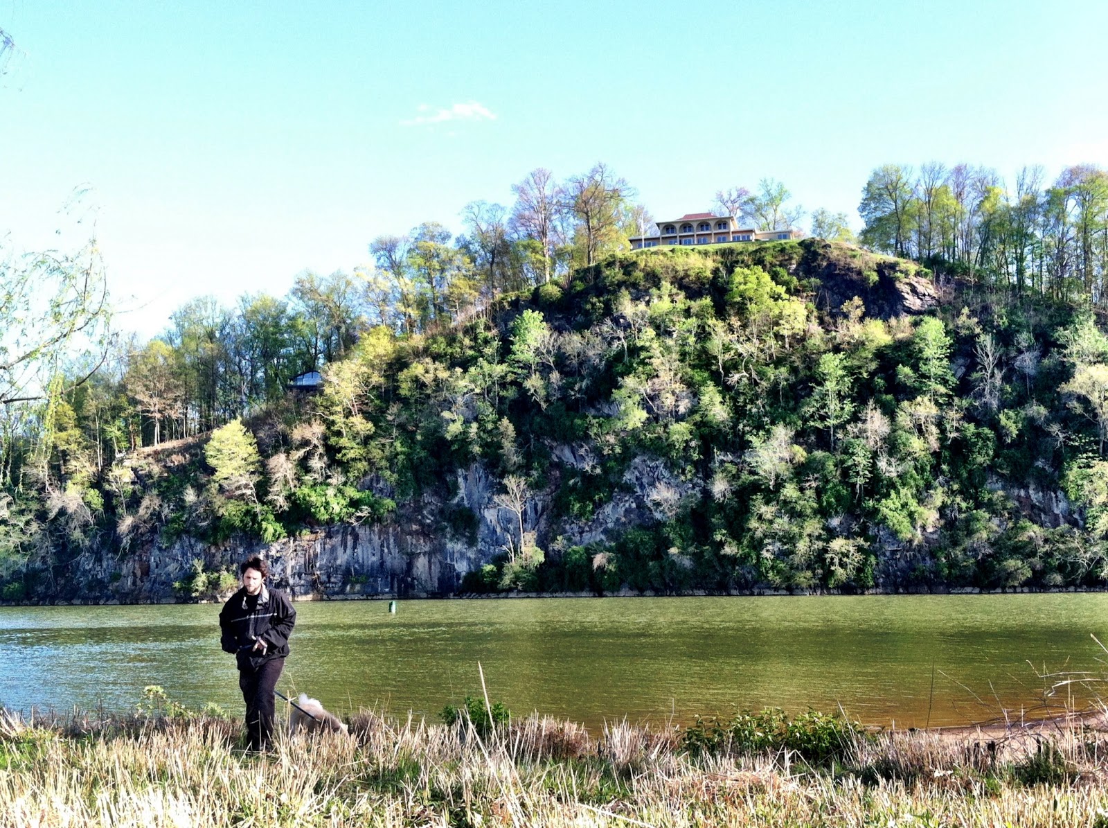 When we arrived and parked, I realized the great job I'd done at hydrating myself. In short, I had to go. KG said he saw a bathroom just a bit down the road on our way in, we could walk there quickly enough across the riverside park (nice open field with some nice tall trees are adorable dogs running about). So we walked. A mile through the park. And there was no saving grace across the way. Just a fancy house, and I didn't want to bother them with my bladder woes. So I started the job back in the opposite direction, knowing full well there was no public restroom that direction either, but there WAS a "TraveLoo" chemical toilet in my van. For "emergency #1's ONLY". But, it was broad daylight in a park parking lot populated by many a park frequenter. Well, when you must you must. I LOVE the Scuttlebuss blinds and curtain we installed. (Purchased at Walmart, for which I have been reprimanded by an Asheville hippie recently...) Even with the blinds and curtain, it was quite a low low on the journey thus far.
